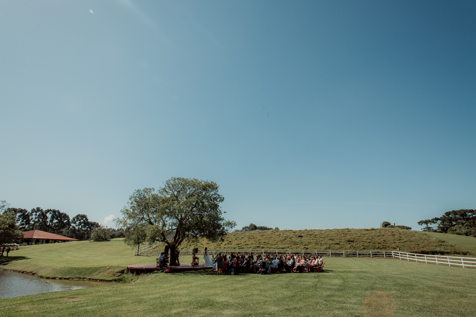 Em uma manhã de domingo, sob a sombra de uma árvore majestosa, cercados pela natureza exuberante e com uma vista deslumbrante para o lago, eles trocaram votos de amor e compromisso...